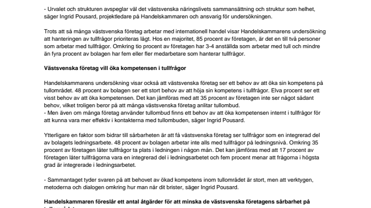 Trots att så många västsvenska företag arbetar med internationell handel visar Handelskammarens undersökning att hanteringen av tullfrågor prioriteras lågt. Hos en majoritet, 85 procent av företagen, är det en till två personer som arbetar med tullfrågor. Omkring tio procent av företagen har 3-4 anställda som arbetar med tull och mindre än fyra procent av bolagen har fem eller fler medarbetare som hanterar tullfrågor.