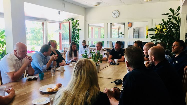 Det blev ett långt samtal om resiliens och samarbete när statsminister Stefan Löfven besökte Södertörns brandförsvarsförbund och brandstationen i Haninge. Stockholms läns landshövding Sven-Erik Österberg och Haninges kommunstyrelseordförande Meeri Wasberg (S) deltog i samtalen.