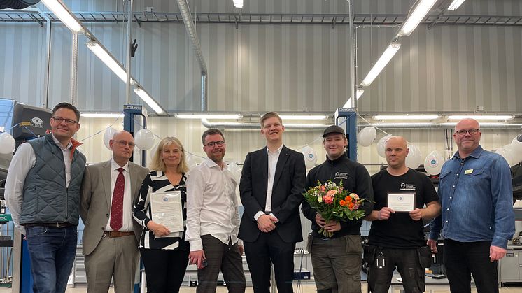 Från vänster till höger: Tomas Tärnfos (Motorbranschcollege), Stefan Sjöquist (Motorbranschcollege), Maria Barnes, biträdande rektor fordons- och transportprogrammet, Fredrika Bremergymnasiet, Morten Sjursen (Olofsson Bil), Adam Simonsson (ordförande i gymnasie- och arbetsmarknadsnämnden), Mattias Svensson (elev), Daniel Diglert (lärare), Jonas Hehrne (verksamhetsledare Motorbranschcollege).