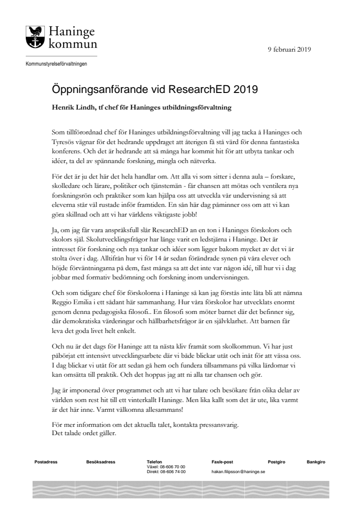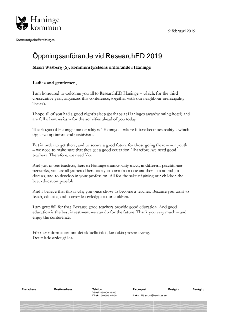 Bland invigningstalarna fanns förutom Eva Hartell även kommunstyrelsens ordförande Meeri Wasberg (S), 1:e vice ordf i kommunstyrelsen Tobias Hammarberg (L), samt Henrik Lindh som är tf chef för utbildningsförvaltningen i Haninge. Bifogat i pressmeddelandet finns deras respektive öppningsanförande.