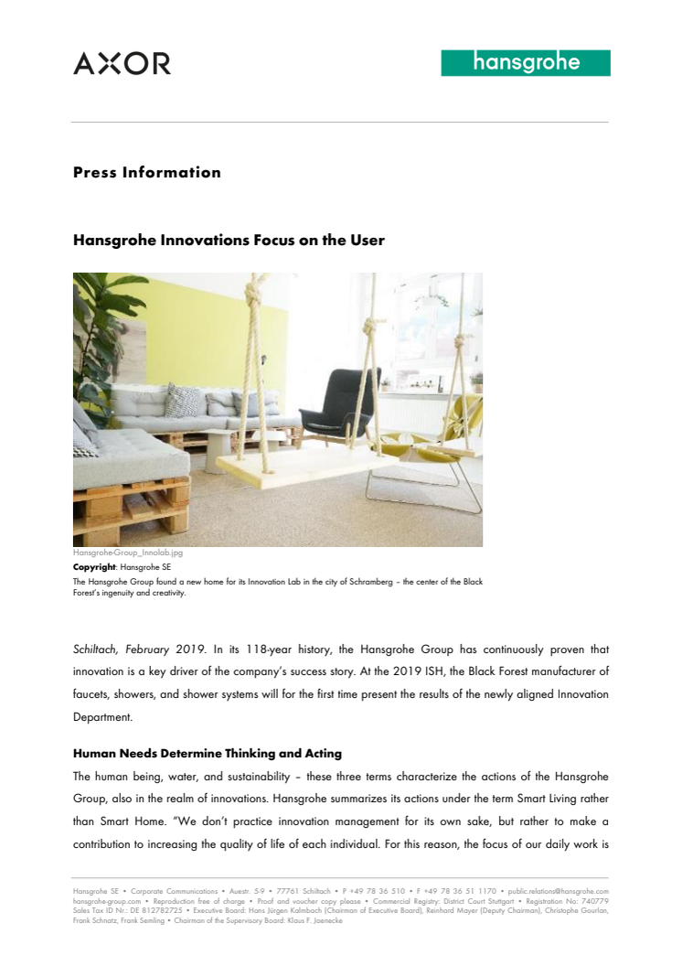 In its 118-year history, the Hansgrohe Group has continuously proven that innovation is a key driver of the company’s success story. At the 2019 ISH, the Black Forest manufacturer of faucets, showers, and shower systems will for the first time present the results of the newly aligned Innovation Department.