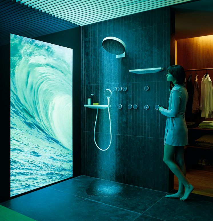 hansgrohe RainTunes duschscenarier kombinerar vattenvolym och temperatur med ljus, musik och doft.
