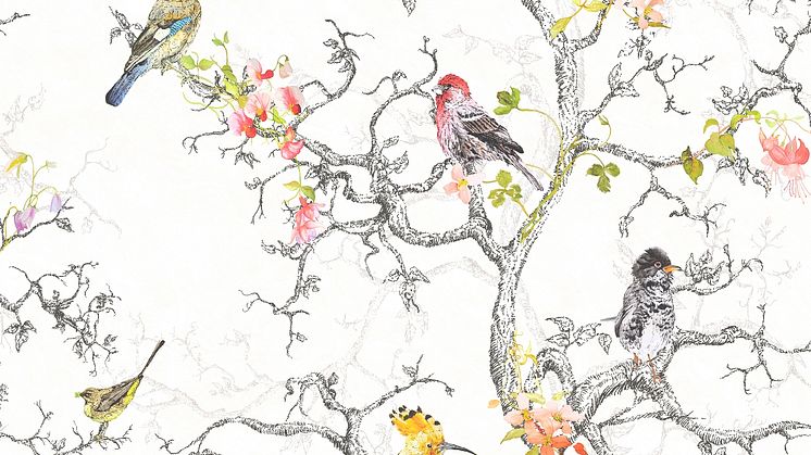 kollektionen Camille och har artikelnummer 97892. Det är en ljus, vacker tapet med härlig vårkänsla. Trädens ljusgröna blad och blommornas knoppar tittar fram. Man kan nästan höra fåglarnas glada kvitter när man tittar på tapeten!