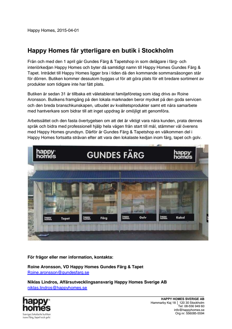 Från och med den 1 april går Gundes Färg & Tapetshop in som delägare i färg- och interiörkedjan Happy Homes och byter då samtidigt namn till Happy Homes Gundes Färg & Tapet. Inträdet till Happy Homes ligger bra i tiden då den kommande sommarsäsongen står för dörren. Butiken kommer dessutom byggas ut för att göra plats för ett bredare sortiment av produkter som tidigare inte har fått plats.