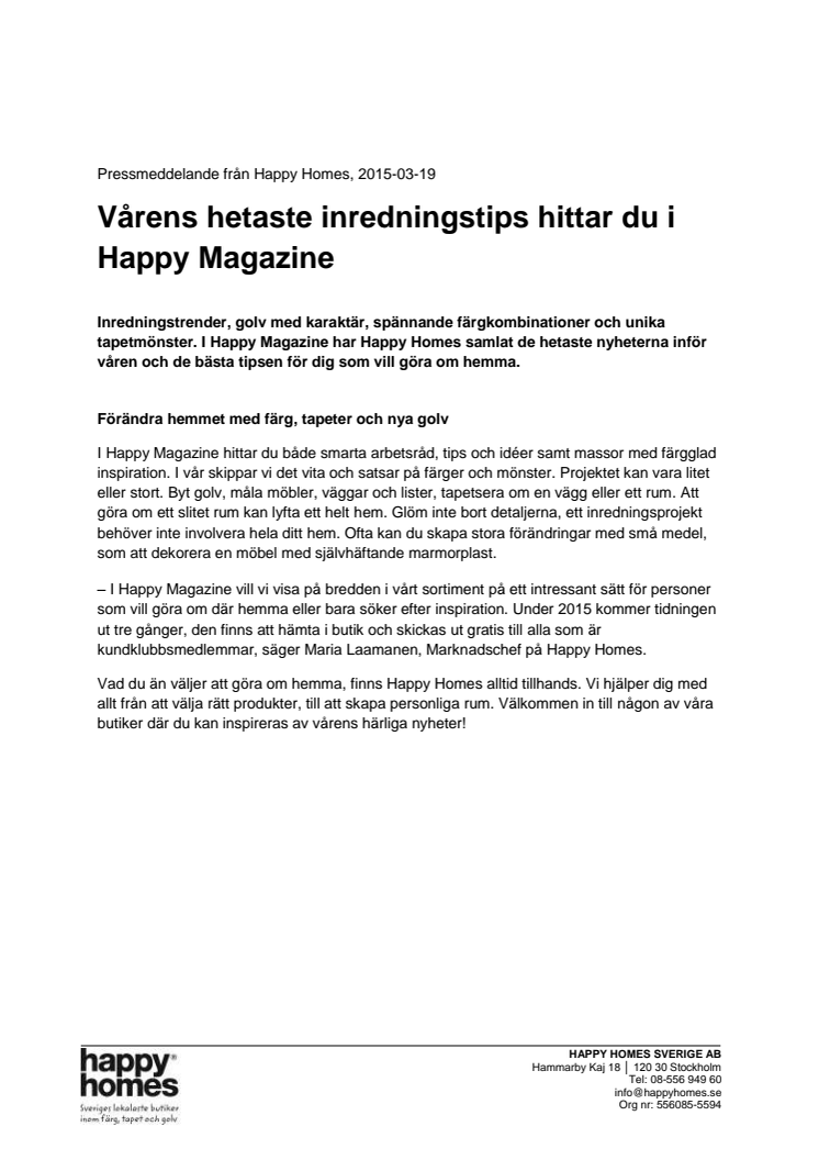 Inredningstrender, golv med karaktär, spännande färgkombinationer och unika tapetmönster. I Happy Magazine har Happy Homes samlat de hetaste nyheterna inför våren och de bästa tipsen för dig som vill göra om hemma.