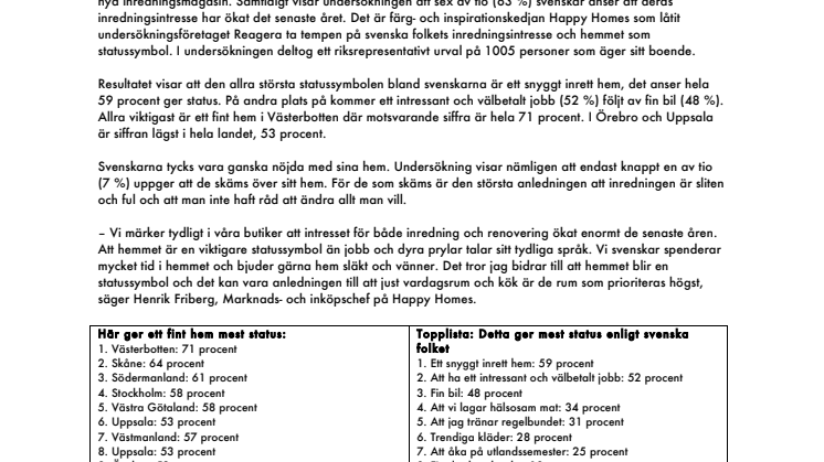 Svenskarna lägger allt mer tid och pengar på att inreda sina hem och tidningshyllorna fylls hela tiden på med nya inredningsmagasin. Samtidigt visar undersökningen att sex av tio (63 %) svenskar anser att deras inredningsintresse har ökat det senaste året. Det är färg- och inspirationskedjan Happy Homes som låtit undersökningsföretaget Reagera ta tempen på svenska folkets inredningsintresse och hemmet som statussymbol. I undersökningen deltog ett riksrepresentativt urval på 1005 personer som äger sitt boende.