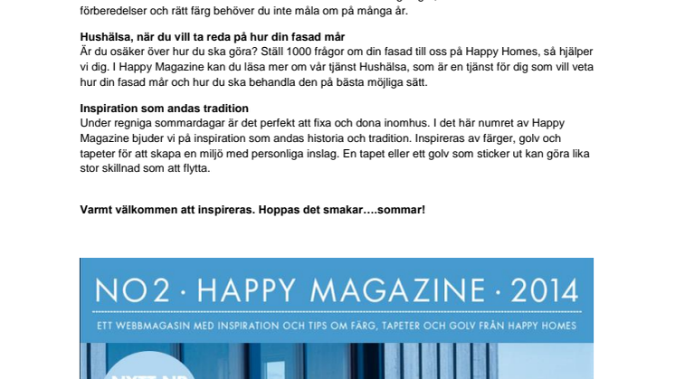 Nu finns andra numret av Happy Homes webbmagasin ute, Happy Magazine, som du kommer till via Happy Homes hemsida. I Happy Magazine hittar du massor med inspiration och tips om färg, tapeter och golv. I detta nummer tar vi oss an förberedelserna inför sommaren och livet i ute på terrassen och i sommarstugan.
