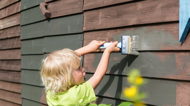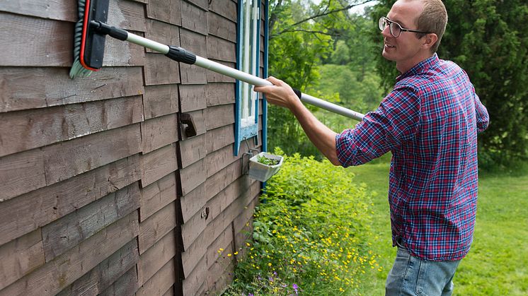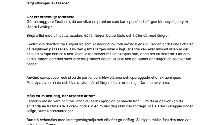 Börja alltid med att tvätta fasaden, då får färgen bättre fäste och håller därmed längre.