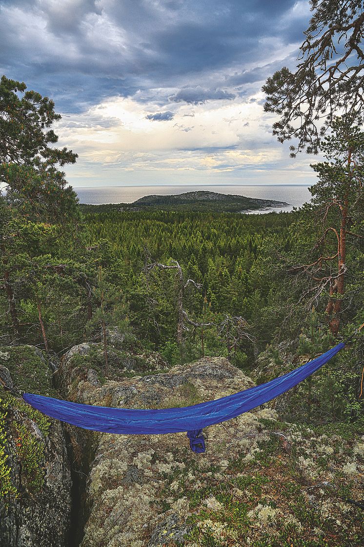 Vila en stund i hängmattan. Här på Speckstaberget med utsikt mot Gånsviken och Notsandsviken. Härnösand. Höga Kusten.