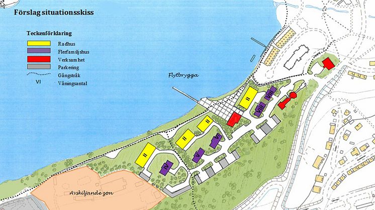 I planprogrammet skissas både radhus på två våningar och flerbostadshus på upp till åtta våningar i området. Radhusen placeras närmast vattnet och flerbostadshusen bakom. Förutom bostäder kan området rymma så kallat icke störande verksamheter som café, restaurang, kontor och mindre tjänsteföretag. Tanken är också att anlägga en strandpromenad, flytbryggor och en torgyta.