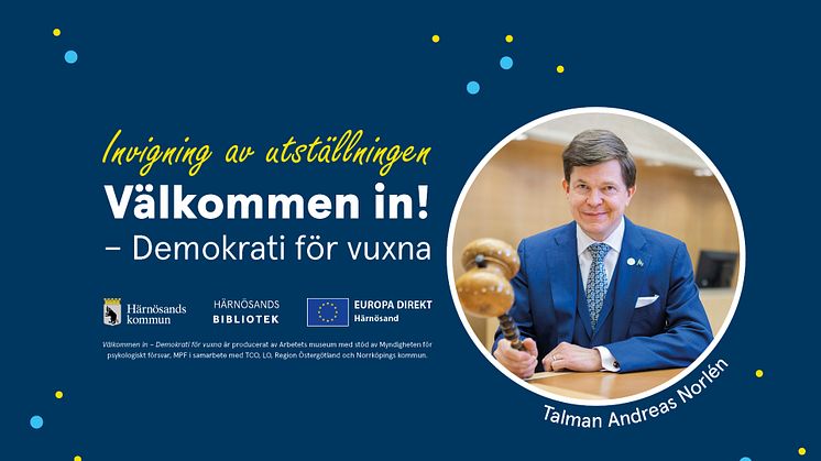 Sveriges talman Andreas Norlén inviger utställningen Välkommen in! – Demokrati för vuxna på Härnösands bibliotek. Invigningen sker torsdag 30 maj och deltar gör också Andreas Sjölander (S), kommunstyrelsens ordförande i Härnösand och Carin Jämtin, landshövding i Västernorrlands län.