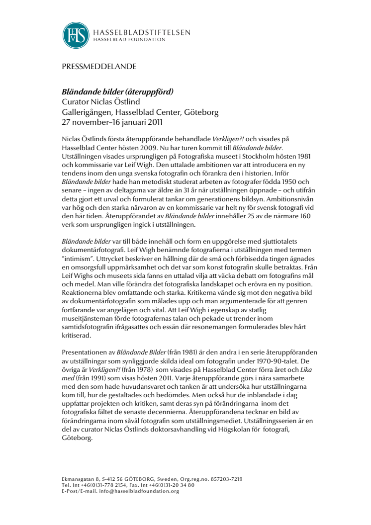 Niclas Östlinds första återuppförande behandlade Verkligen?! och visades på Hasselblad Center hösten 2009. Nu har turen kommit till Bländande bilder.
