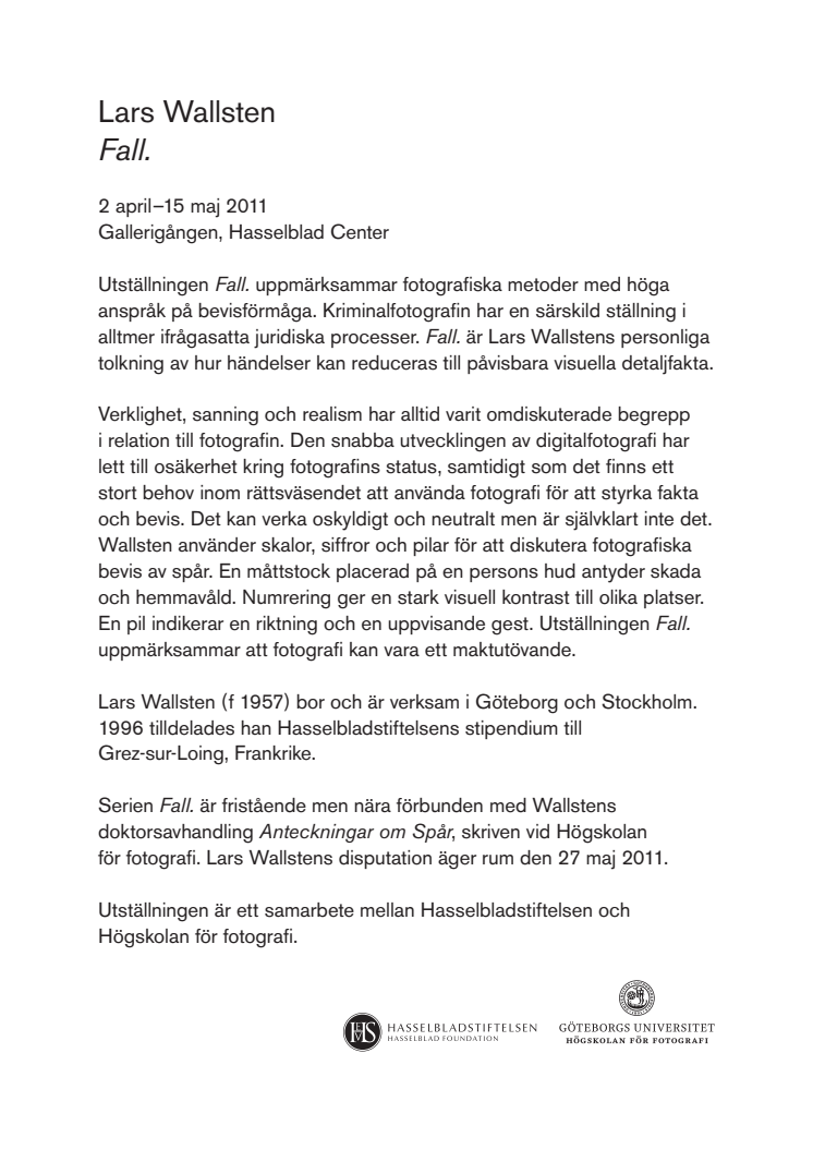 Utställningen Fall. uppmärksammar fotografiska metoder med höga anspråk på bevisförmåga. Kriminalfotografin har en särskild ställning i alltmer ifrågasatta juridiska processer. Fall. är Lars Wallstens personliga tolkning av hur händelser kan reduceras till påvisbara visuella detaljfakta.