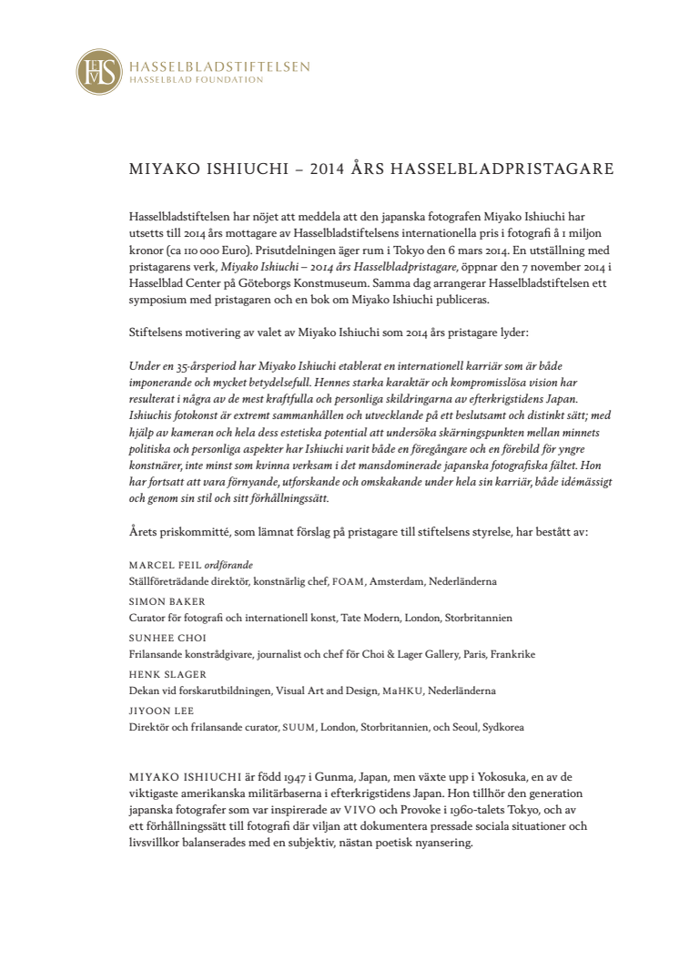 Hasselbladstiftelsen har nöjet att meddela att den japanska fotografen Miyako Ishiuchi har utsetts till 2014 års mottagare av Hasselbladstiftelsens internationella pris i fotografi å 1 miljon kronor (ca 110 000 Euro). Prisutdelningen äger rum i Tokyo den 6 mars 2014.