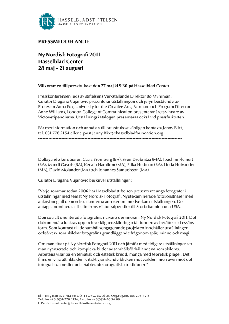 Välkommen till pressfrukost den 27 maj kl 9.30 på Hasselblad Center