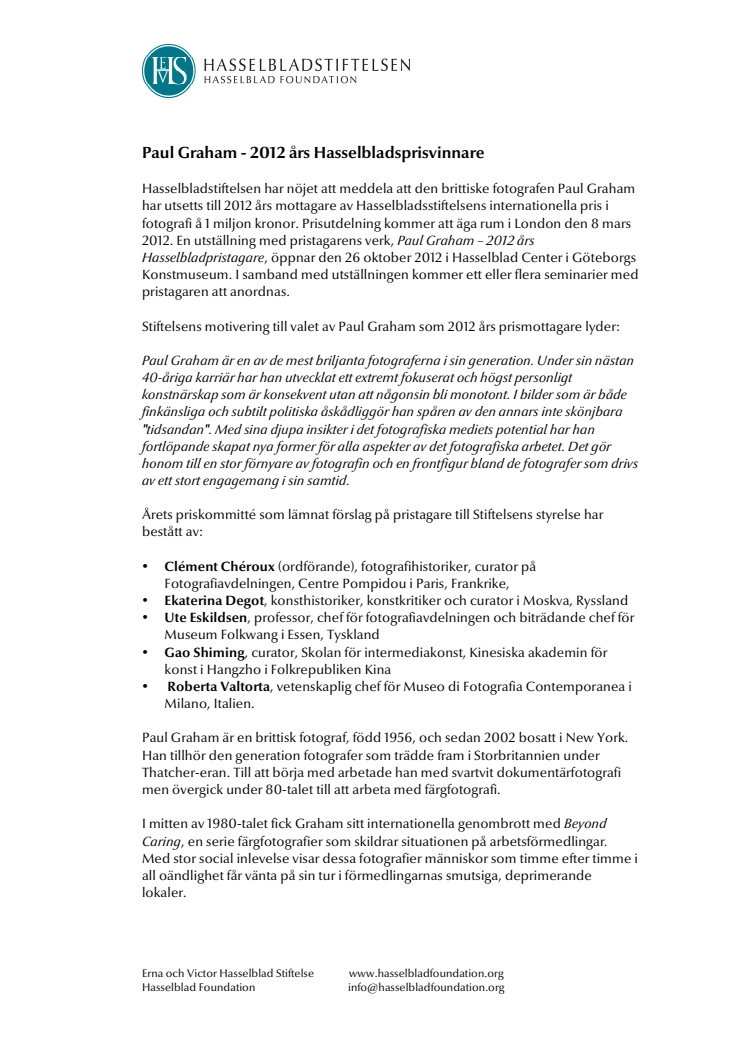 Den brittiske fotografen Paul Graham har utsetts till 2012 års mottagare av Hasselbladsstiftelsens internationella pris i fotografi