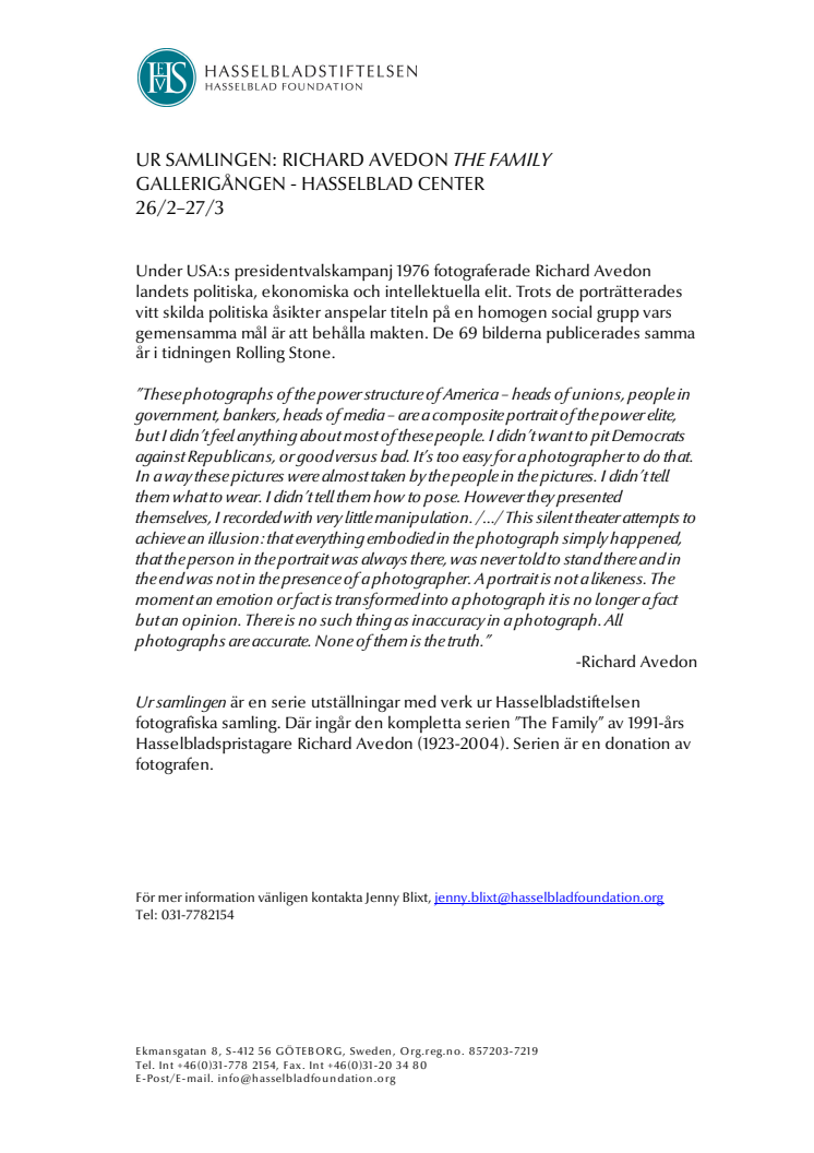 Under USA:s presidentvalskampanj 1976 fotograferade Richard Avedon landets politiska, ekonomiska och intellektuella elit. De 69 bilderna publicerades samma år i tidningen Rolling Stone. Den kompletta serien ”The Family” av 1991-års Hasselbladspristagare Richard Avedon (1923-2004) ingår in Hasselbladstiftelsens fotografiska samling . Serien är en donation av fotografen.