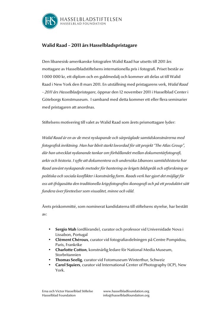 Den libanesisk-amerikanske fotografen Walid Raad har utsetts till 2011 års mottagare av Hasselbladstiftelsens internationella pris i fotografi. Priset består av 1 000 000 kr, ett diplom och en guldmedalj och kommer att delas ut till Walid Raad i New York den 8 mars 2011.