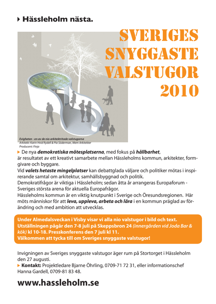 Under Almedalsveckan i Visby visar Hässleholms kommun nio arkitektritade valstugor i bild och text. De nya demokratiska mötesplatserna, med fokus på hållbarhet, är resultatet av ett kreativt samarbete mellan Hässleholms kommun, arkitekter, formgivare och byggare.
