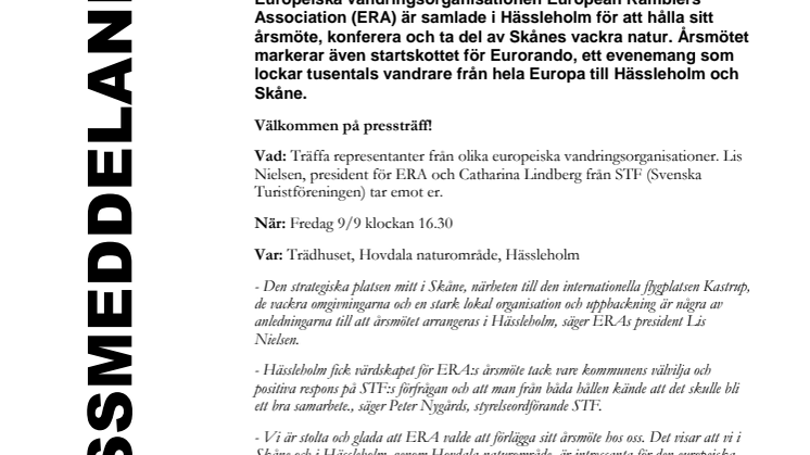 Europeiska vandringsorganisationen European Ramblers' Association (ERA) är samlade i Hässleholm för att hålla sitt årsmöte, konferera och ta del av Skånes vackra natur. Årsmötet markerar även startskottet för Eurorando, ett evenemang som lockar tusentals vandrare från hela Europa till Hässleholm och Skåne.