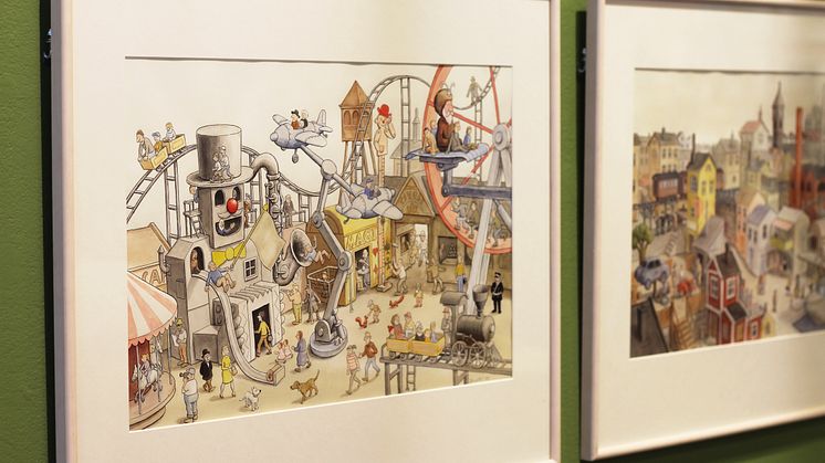 – Det känns fantastiskt att få välkomna Jan Lööf hit och låta besökarna få kliva in i hans bildvärld, här i vårt kulturhus, säger Kulturutvecklare Catharina Hjalmarsson. I flera veckor har vi jobbat med att bygga upp en lekfull miljö med inspiration från Lööfs fantasifulla böcker.
