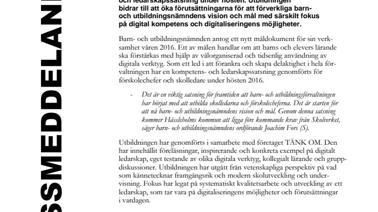 - Det är en viktig satsning för framtiden att barn- och utbildningsförvaltningen har börjat med att utbilda skolledarna och förskolecheferna. Det är starten för att nå barn- och utbildningsnämndens vision och mål. Genom denna satsning kommer Hässleholms kommun att ligga före kommande krav från Skolverket, säger barn- och utbildningsnämndens ordförande Joachim Fors (S).