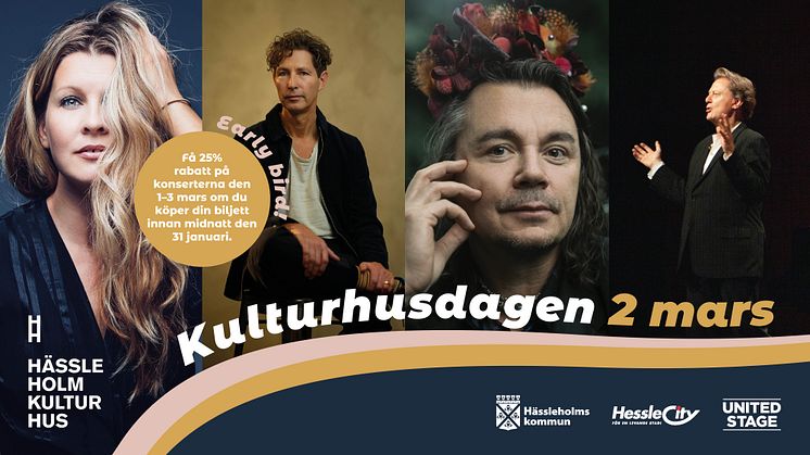 Passa på! Just nu får du 25% rabatt på konserterna den 1–3 mars. Erbjudandet gäller för köpta biljetter fram till och med midnatt den 31 januari. Köp din biljett online eller i vår biljettkassa på entréplan (tel. 0451–26 66 70).