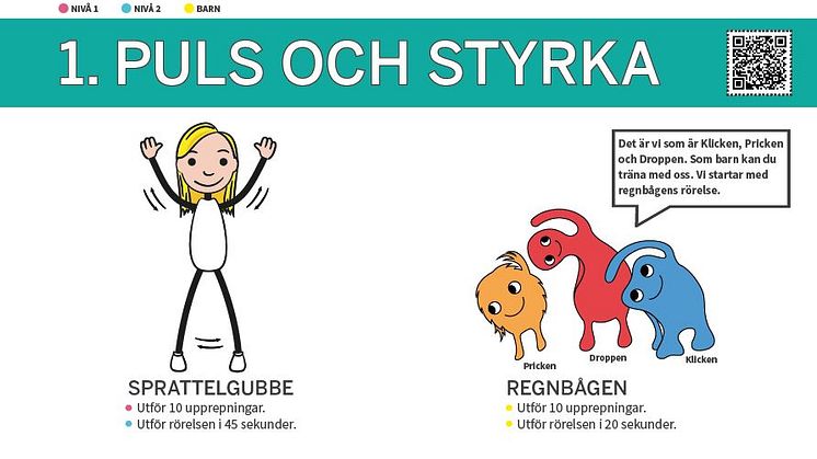 Aktivitetsrundorna för puls och styrka är tänkta som en slags cirkelträning för kroppens alla muskelgrupper. Vid 12 stationer längs varje motionsspår finns roliga övningar och kul fakta om hälsa och motion. För vuxna finns två olika svårighetsnivåer och för barn hjälper figurerna "Klicken med vänner" till med hur övningarna ska utföras. Med QR-koder kan man titta på korta filmer om hur övningarna bör göras på bästa sätt.