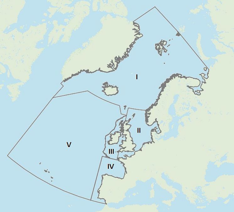 Ospar-konventionen omfattar ett cirka 13,5 miljoner kvadratkilometer stort havsområde som sträcker sig från Arktis i norr till den oceaniska mittatlantiska ryggen i väst och Gibraltar i syd. Delområde 1 är Arktis, delområde 2 är Nordsjön (inklusive Skagerrak och Kattegatt), delområde 3 är Irländska sjön, delområde 4 Biscayabukten och delområde 5 är Mitt-Atlanten.