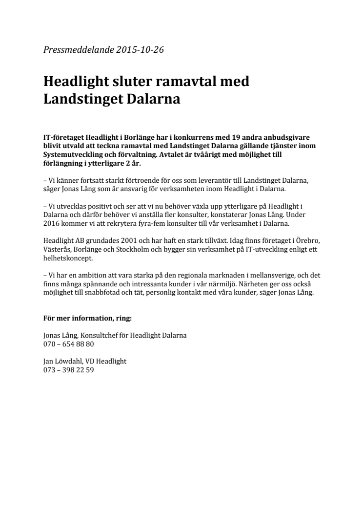 IT-företaget Headlight i Borlänge har i konkurrens med 19 andra anbudsgivare blivit utvald att teckna ramavtal med Landstinget Dalarna gällande tjänster inom Systemutveckling och förvaltning. Avtalet är tvåårigt med möjlighet till förlängning i ytterligare 2 år.