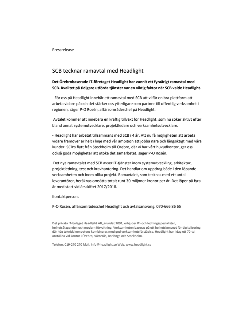 Det Örebrobaserade IT-företaget Headlight har vunnit ett fyraårigt ramavtal med SCB. Kvalitet på tidigare utförda tjänster var en viktig faktor när SCB valde Headlight.