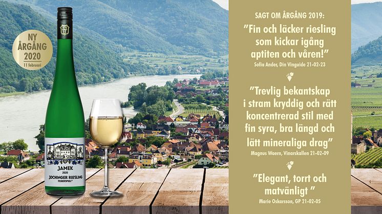 Den 11 februari lanseras årgång 2020 av exklusiva Jamek Jochinger Riesling från Weingut Jamek, en av Österrikes främsta vingårdar. Endast 3.000 flaskor levereras till Sverige och Systembolagets TSV-sortiment.