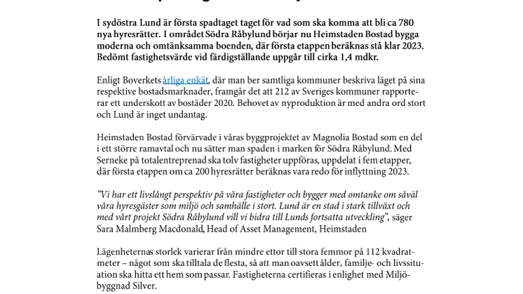 I sydöstra Lund är första spadtaget taget för vad som ska komma att bli omkring 780 nya hyresrätter. I området Södra Råbylund börjar nu Heimstaden Bostad bygga moderna och omtänksamma boenden, där första etappen beräknas stå klar 2023. Bedömt fastighetsvärde vid färdigställande uppgår till cirka 1,4 mdkr.