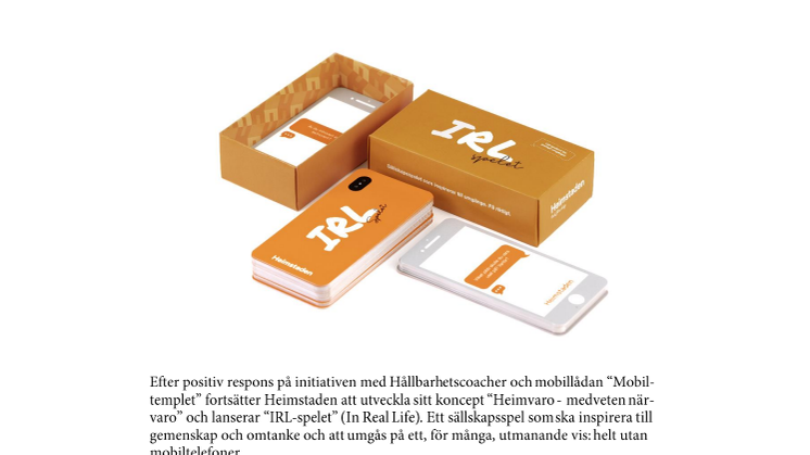 Efter positiv respons på initiativen med Hållbarhetscoacher och mobillådan “Mobiltemplet” fortsätter Heimstaden att utveckla sitt koncept “Heimvaro - medveten närvaro” och lanserar “IRL-spelet” (In Real Life). Ett sällskapsspel som ska inspirera till gemenskap och omtanke och att umgås på ett, för många, utmanande vis: helt utan mobiltelefoner.