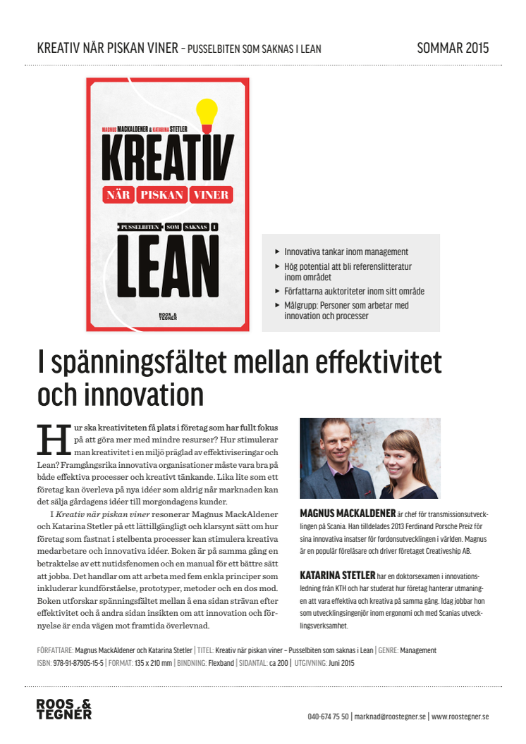 Hur ska kreativiteten få plats i företag som har fullt fokus på att göra mer med mindre resurser? Hur stimulerar man kreativitet i en miljö präglad av effektiviseringar och Lean? Framgångsrika innovativa organisationer måste vara bra på både effektiva processer och kreativt tänkande.