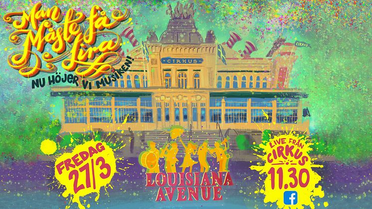 "Man måste få lira" är ett initiativ av glädjeorkestern Louisiana Avenue i samarbete med Cirkus, Scenteknik och Ticketmaster. Detta har utmynnat i en unik konsert som kommer att livesändas 27 mars 11.30 från Cirkus på Djurgården. Konserten framförs utan publik på plats men istället bjuder vi in hela världen för att få ta del av denna maxade upplevelse via Facebook.