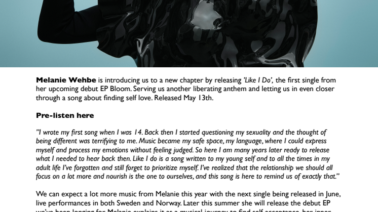 We can expect a lot more music from Melanie this year with the next single being released in June, live performances in both Sweden and Norway. Later this summer she will release the debut EP we’ve been longing for. Melanie explains it as a musical journey to find self-acceptance, her inner strength and to bloom as a person. The entire EP is being released independently with her handpicked team. The decision was easy to make, she needed to learn how to prioritize herself and be creatively free with opinions only from people that knows her the best.