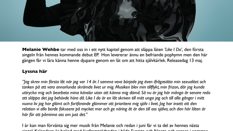Melanie Wehbe tar här med oss in i ett nytt kapitel genom att släppa låten ’Like I Do’, den första singeln från hennes kommande debut EP. Hon levererar ännu en befriande pophymn men den här gången får vi lära känna henne djupare genom en låt om att hitta självkärlek.