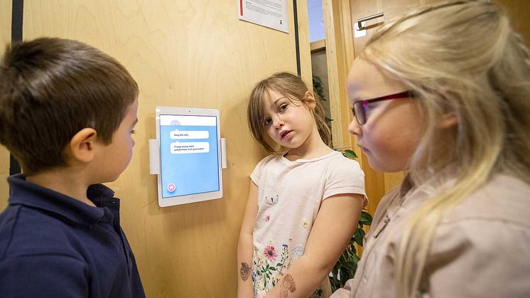 Klockan är strax efter nio och barnen på Råå förskola är på väg ut för att leka på gården. I entrén trängs barnen runt en ipad som hänger på väggen. Lucia Ratkov Darrell trycker vant på en ikon på skärmen och en entonig röst hörs från paddan: “Det är ganska soligt. Ta på dig keps, varm tröja, skor och kanske solkräm.” Ben Berg som är fyra år springer till sitt fack och hämtar solkrämen men hejdar sig.