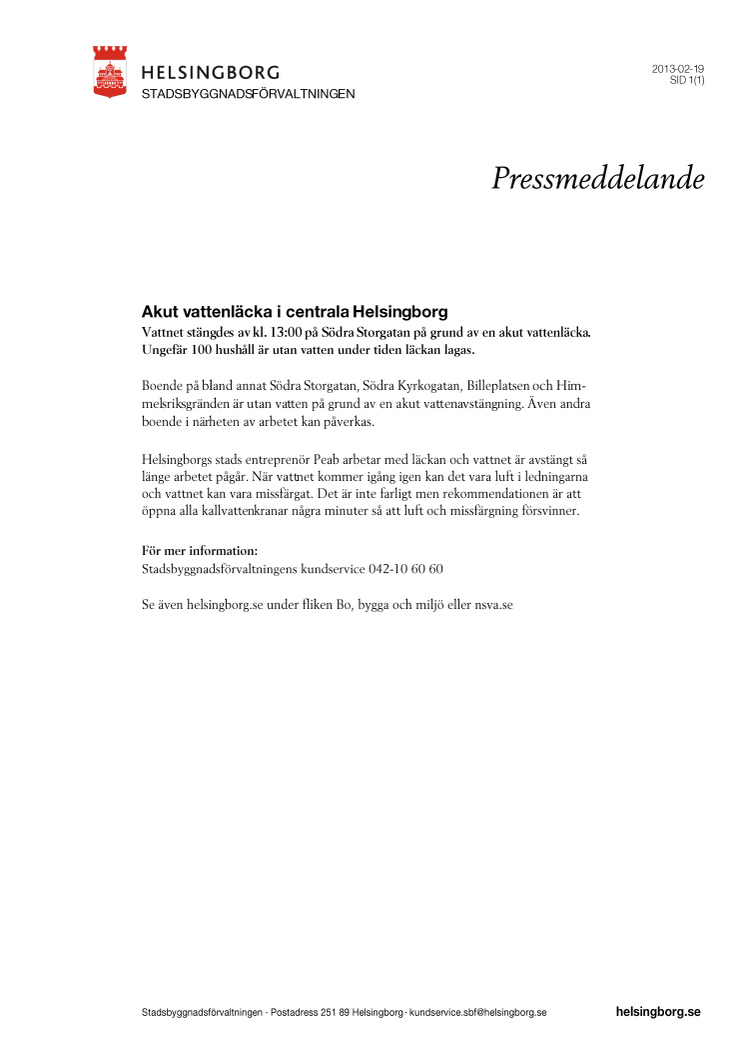 Vattnet stängdes av kl. 13:00 på Södra Storgatan på grund av en akut vattenläcka. Ungefär 100 hushåll är utan vatten under tiden läckan lagas.