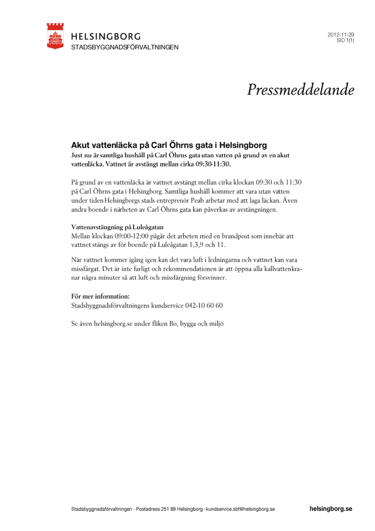 Klockan 09:30 är samtliga hushåll på Carl Öhrns gata utan vatten på grund av en akut vattenläcka. Vattnet är avstängt till cirka 11:30.