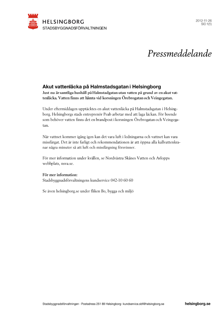 Just nu är samtliga hushåll på Halmstadgatan utan vatten på grund av en akut vattenläcka. Vatten finns att hämta vid korsningen Örebrogatan och Veingegatan.