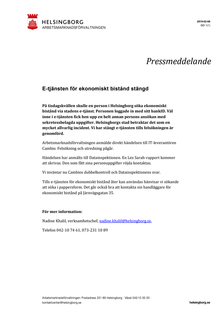 På tisdagskvällen skulle en person i Helsingborg söka ekonomiskt bistånd via stadens e-tjänst. Personen loggade in med sitt bankID. Väl inne i e-tjänsten fick hen upp en helt annan persons ansökan med sekretessbelagda uppgifter. Helsingborgs stad betraktar det som en mycket allvarlig incident. Vi har stängt e-tjänsten tills felsökningen är genomförd.