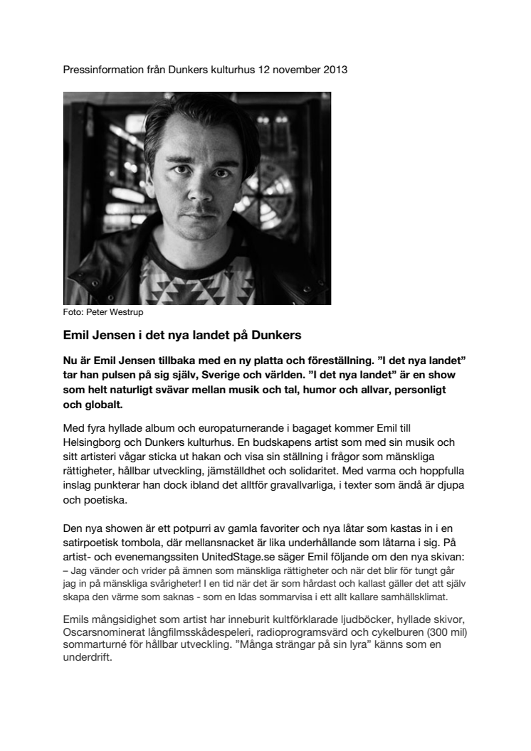 Nu är Emil Jensen tillbaka med en ny platta och föreställning. ”I det nya landet” tar han pulsen på sig själv, Sverige och världen. ”I det nya landet” är en show som helt naturligt svävar mellan musik och tal, humor och allvar, personligt och globalt. 16 November kommer han till Dunkers kulturhus i Helsingborg.