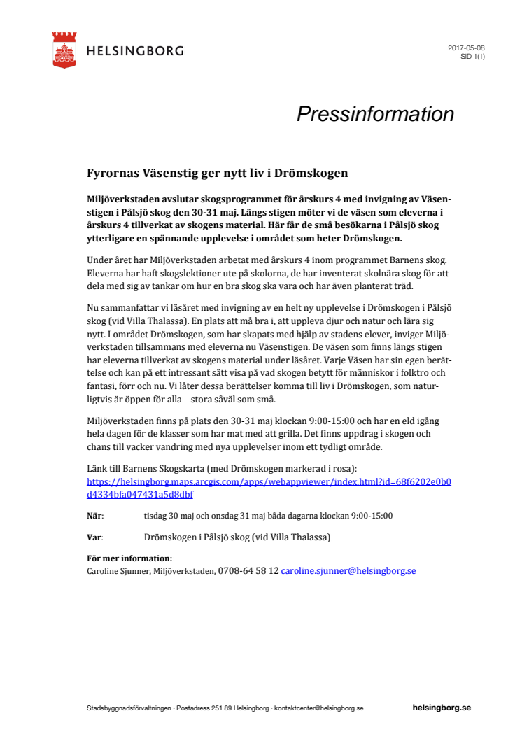 Miljöverkstaden avslutar skogsprogrammet för årskurs 4 med invigning av Väsen-stigen i Pålsjö skog den 30-31 maj. Längs stigen möter vi de väsen som eleverna i årskurs 4 tillverkat av skogens material. Här får de små besökarna i Pålsjö skog ytterligare en spännande upplevelse i området som heter Drömskogen.