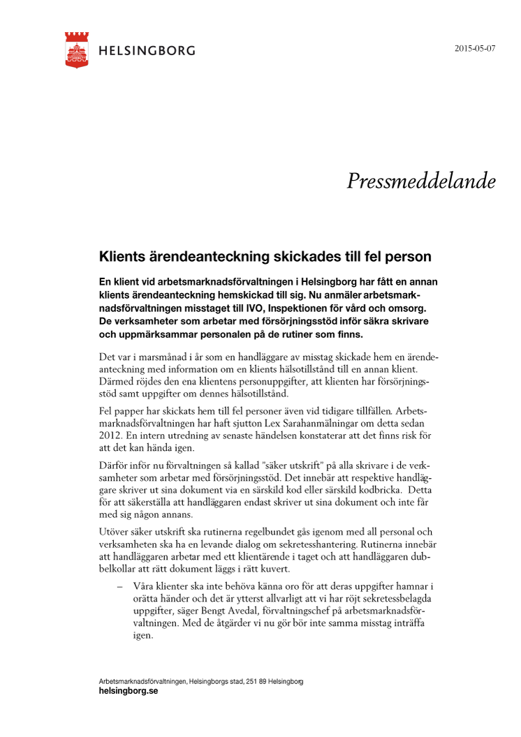 En klient vid arbetsmarknadsförvaltningen i Helsingborg har fått en annan klients ärendeanteckning hemskickad till sig. Nu anmäler arbetsmarknadsförvaltningen misstaget till IVO, Inspektionen för vård och omsorg. De verksamheter som arbetar med försörjningsstöd inför säkra skrivare och uppmärksammar personalen på de rutiner som finns.