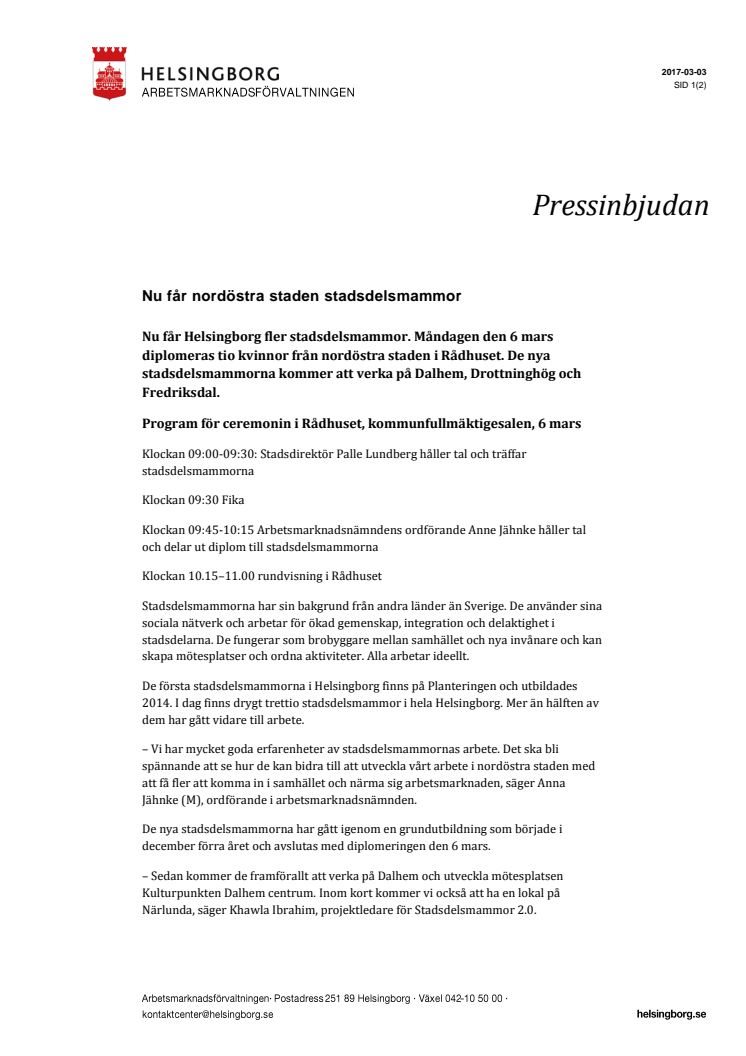 Nu får Helsingborg fler stadsdelsmammor. Måndagen den 6 mars diplomeras tio kvinnor från nordöstra staden i Rådhuset. De nya stadsdelsmammorna kommer att verka på Dalhem, Drottninghög och Fredriksdal.
