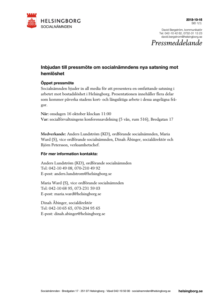 Socialnämnden bjuder in all media för att presentera en omfattande satsning i arbetet mot bostadslöshet i Helsingborg. Presentationen innehåller flera delar som kommer påverka stadens kort- och långsiktiga arbete.