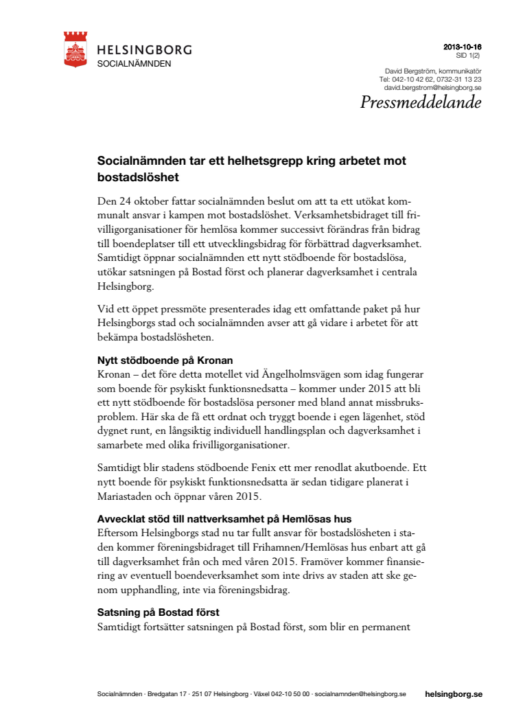 Den 24 oktober fattar socialnämnden beslut om att ta ett utökat kommunalt ansvar i kampen mot bostadslöshet. Verksamhetsbidraget till frivilligorganisationer förändras, från bidrag till boendeplatser till ett utvecklingsbidrag för dagverksamhet. Samtidigt öppnar socialnämnden ett nytt stödboende för bostadslösa, utökar satsningen på Bostad först och planerar dagverksamhet i centrala Helsingborg.