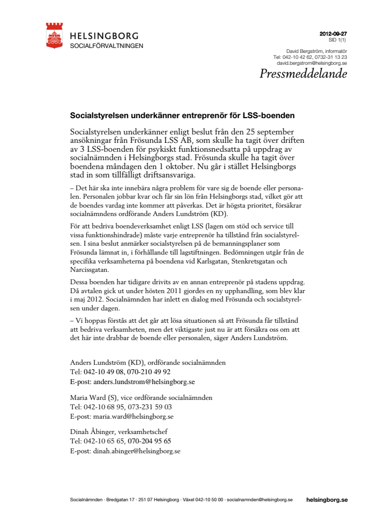 Socialstyrelsen underkänner enligt beslut från den 25 september ansökningar från Frösunda LSS AB, som skulle ha tagit över driften av 3 LSS-boenden för psykiskt funktionsnedsatta på uppdrag av socialnämnden i Helsingborgs stad. Frösunda skulle ha tagit över boendena måndagen den 1 oktober. Nu går i stället Helsingborgs stad in som tillfälligt driftsansvariga.